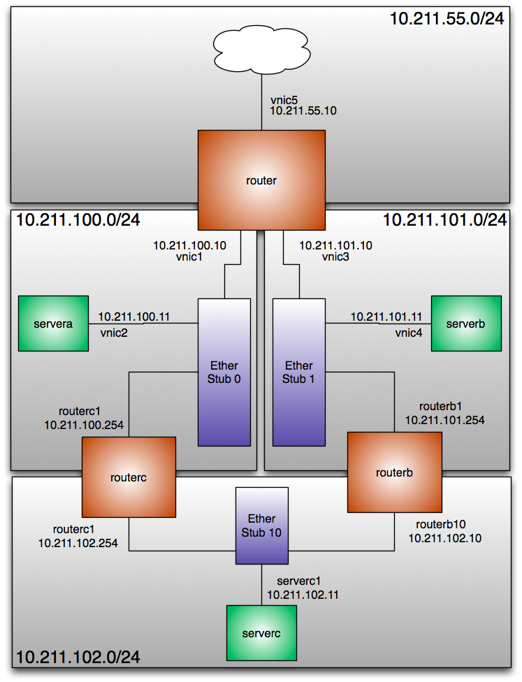 Normally a network consists out of switches and networking cards, server and router . It’s easy to replicate this in a single system. Networking cards can be simulated by VNICS, switches are called etherstubs in the namespace of Crossbow. Server can be simulated by zones of course, and as router are not much more than special-purpose servers, we could simulate them by a zone as well.