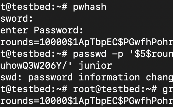 root@testbed:~# passwd -p '$5$rounds=10000$1ApTbpEC$PGwfhPohr27EbTlmnEo9t45uXdRTqutuhowQ3W206Y/' junior